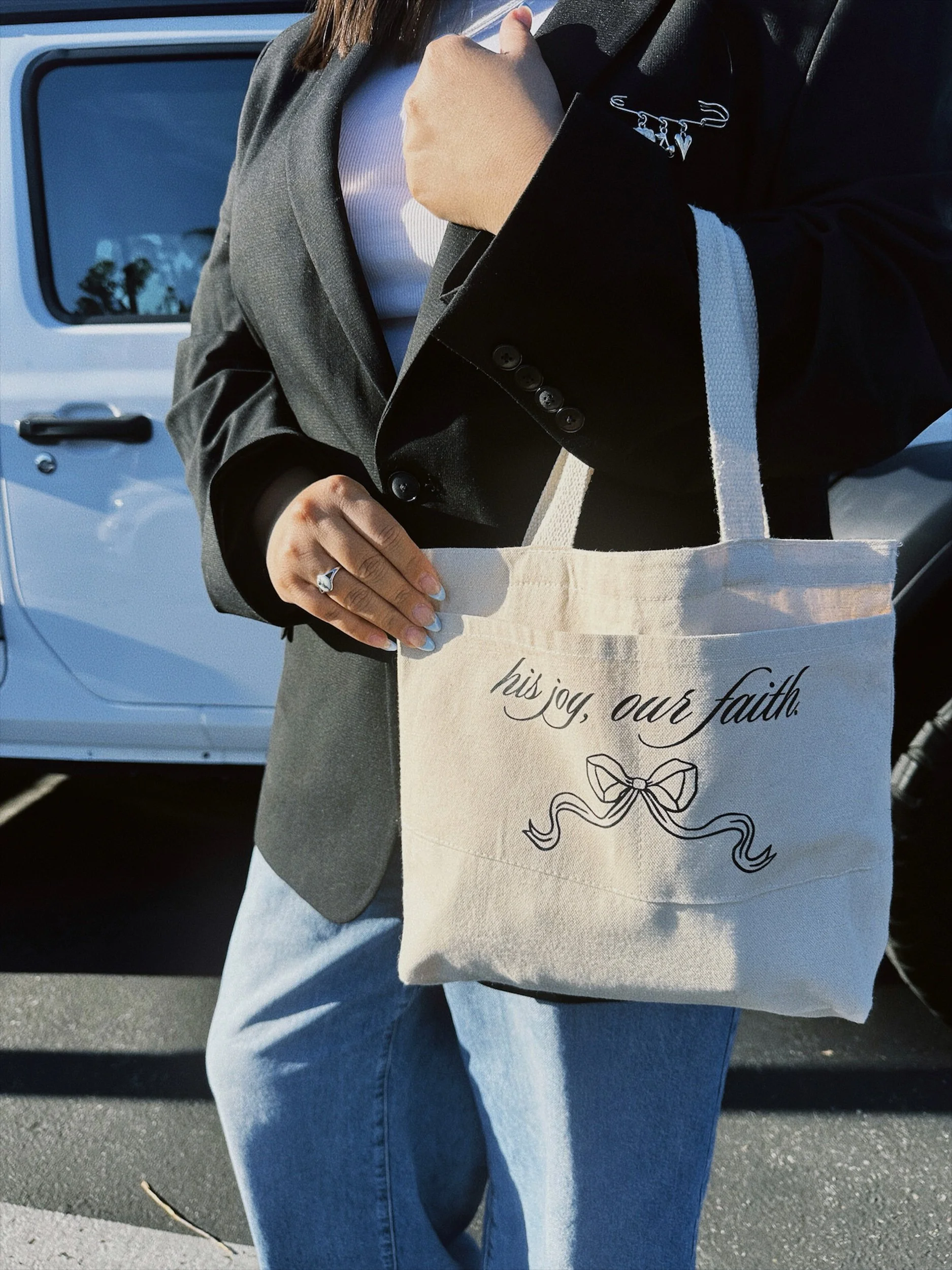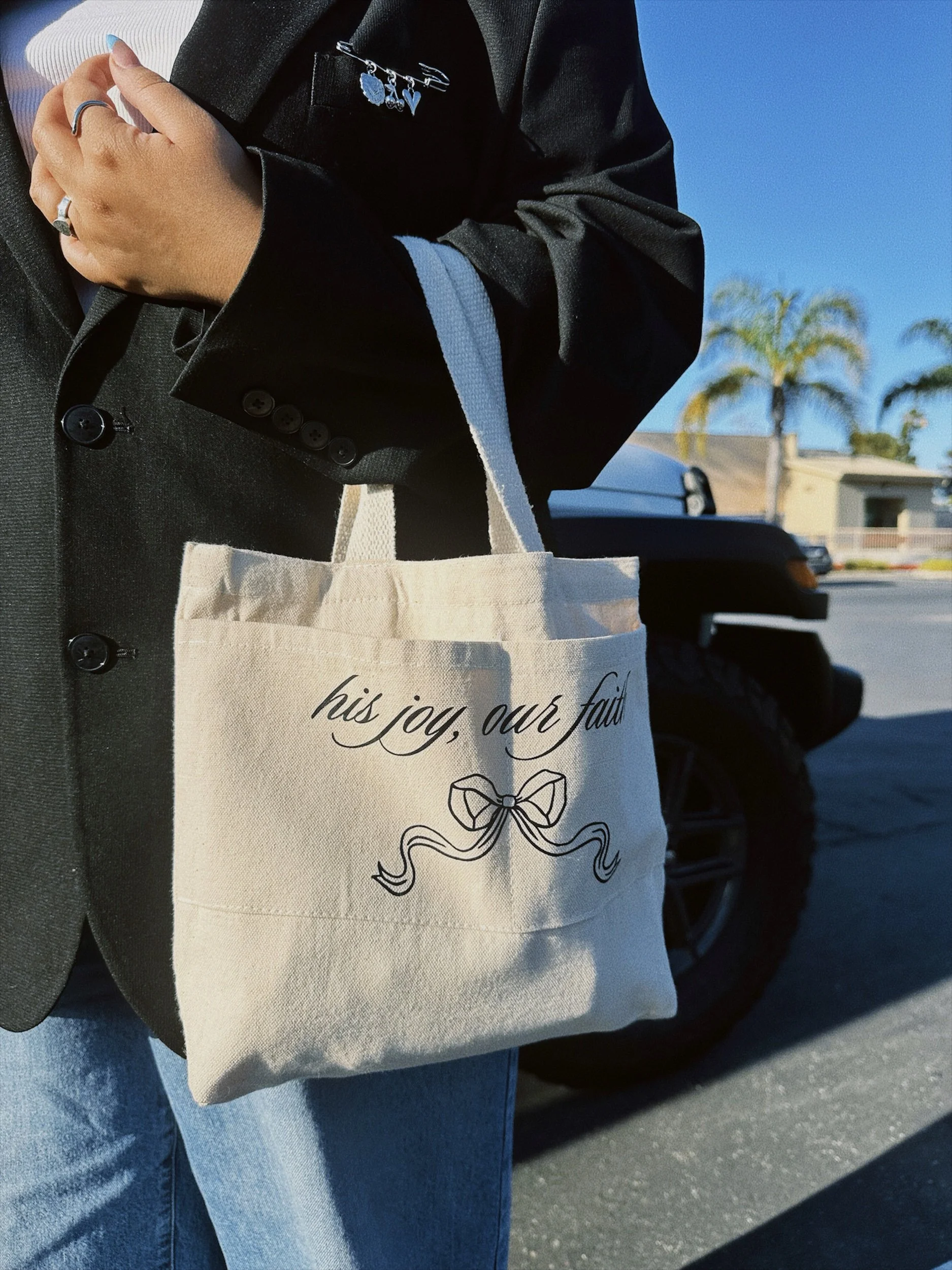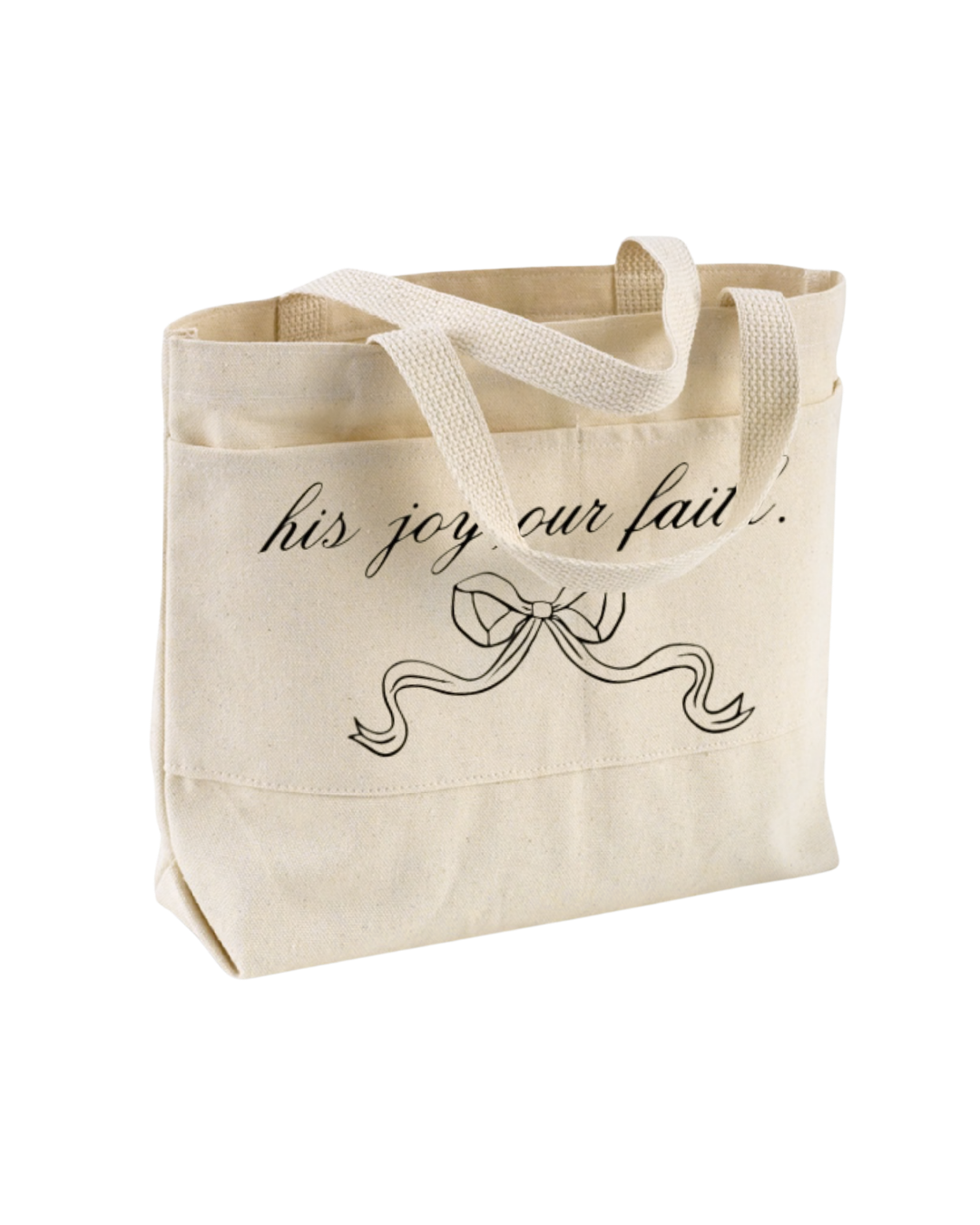 The perfect mini tote for carrying your Bible with ease & intention. The two front pockets are perfect for keeping your Bible journaling essentials organized and within reach think highlighters, pens, sticky notes, & all your journaling essentials!